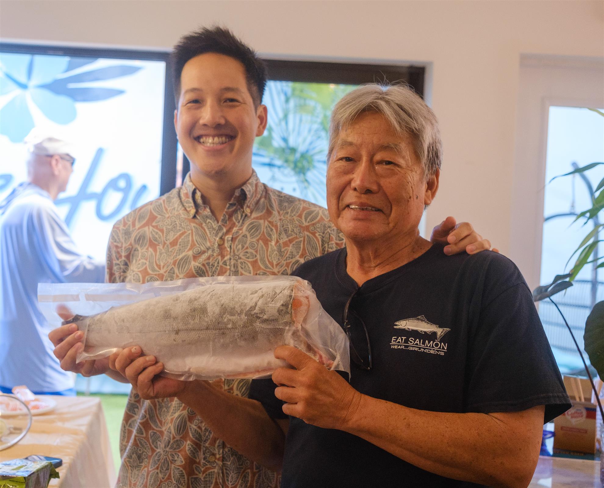 And a special mahalo to Wes Mun for treating the club to a delicious salmon breakfast, fresh from his Alaskan catch! Wes also raffled off salmon as a Polio Plus fundraiser and Evan was the big winner! Next up is Wes Munʻs Salmon Dinner coming up on Saturday, September 20th. See Event Calendar for details.